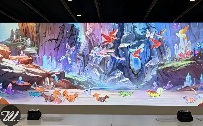 Beginning on paper, participants assign colors to predesigned characters. Individual creations are translated into moving imagery and integrated into the larger spatial narrative. Seven characters coexist, flow, and overlap within a shared gemstone-cave world.